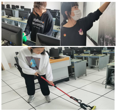 活动开始,负责人给志愿者们进行分工,并分发了打扫工具。有的志愿者拿着帕子擦电脑,有的志愿者拿着扫把扫地,有的志愿者拿着捆扎带捆电脑插座线子。志愿者们在打扫的过程中交流怎么打扫,怎么能把线子捆得更美观,在打扫过程中互相指出不足并加整改。