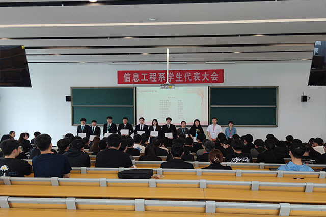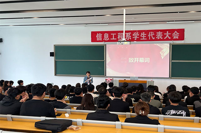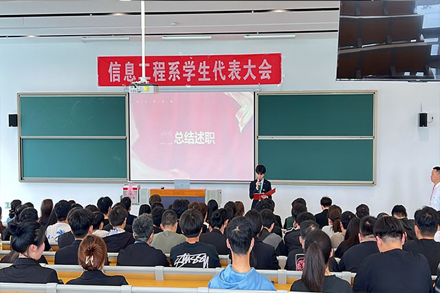 2023年4月18日下午1点,亚搏在线信息工程系第四届学生代表大会在善学楼103顺利召开。信息工程系党支部书记胡枫、党支部组织委员兼团总支书记俞宝莹、党支部青年委员兼学生会指导老师郝麒、学工处老师顾窗林、全体辅导员老师及118名学生代表出席了本次大会。大会由学生会指导老师郝麒主持。