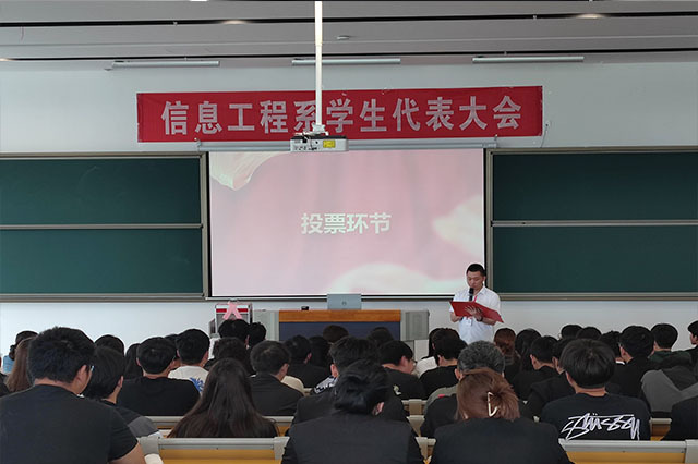 信息工程系团总支代表吴雨蔓宣读学生代表大会贺词,学生会主席李想宣读信息工程系第四次学生代表大会代表资格审查报告,学生会副主席陶林峰宣读《亚搏在线信息工程系第四次学生代表大会选举办法》,各项报告在热烈的掌声中一致通过。