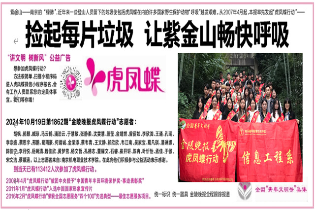 为进一步激发信息工程系师生的环保意识和奉献精神,1019日上午,信息工程系党支部书记胡枫、青年委员、关心下一代工作委员会秘书长郝麒、宣传委员臧琼带领30名团学骨干前往南京紫金山开展“虎凤蝶”志愿行动。通过党建带团建,以实际行动守护自然环境,推动绿色发展。