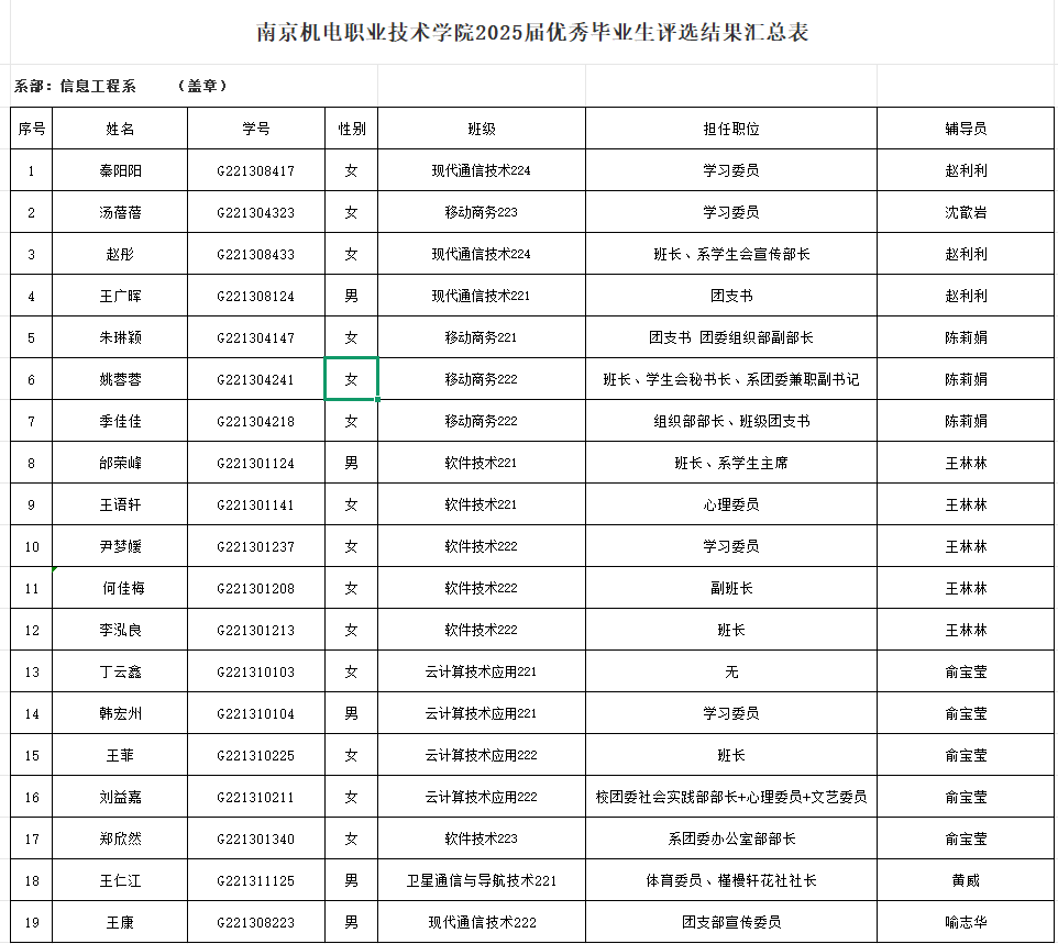 根据《关于评选2025届优秀毕业生的通知》(南机电院学﹝2025﹞4号)文件精神,经班级评选,系部审核,决定拟推荐以下17名同学为2025届亚搏在线优秀毕业生。现予以公示,公示时间:2025年4月24日——2025年4月26日。联系人:郝麒,电话:18061237654。