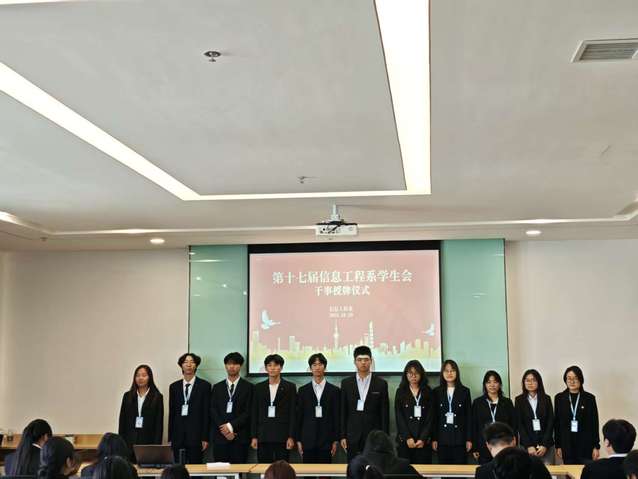 为强化学生会组织建设,明晰干事职责使命,凝聚团队服务力量,10月29日,信息工程系在“一站式”学生社区隆重举办第十七届学生会干事授牌仪式。信息工程系党支部青年统战委员、关心下一代工作委员会秘书、学生会指导老师郝麒及第十七届学生会全体成员共同参与,仪式在庄重而热烈的氛围中有序开展。