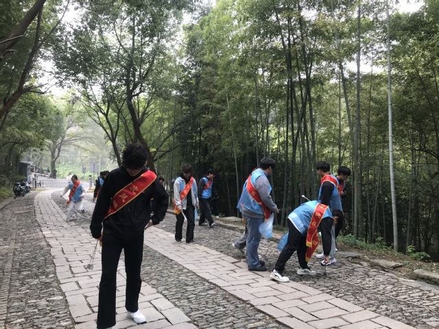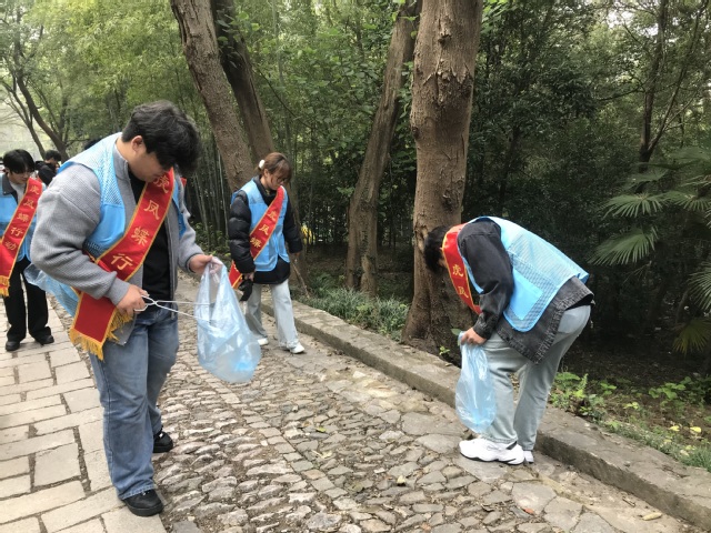 尽管山间透着些许凉意,却丝毫阻挡不了师生们的服务热情。志愿者们手持垃圾袋和捡拾工具,沿紫金山步道有序推进,对沿途塑料瓶、食品包装袋、烟头纸屑等各类垃圾进行全面清理。大家分工明确、默契配合,弯腰捡拾的身影在青山绿树间格外醒目。面对草丛、石缝中隐藏的垃圾,师生们耐心细致地逐一清理,坚决不留卫生死角。志愿者们的实干精神感染了不少沿途游客,他们主动上前询问活动详情,部分市民更是当场加入捡拾队伍,形成了“党建引领、志愿示范、全民参与”的良好生态保护氛围。