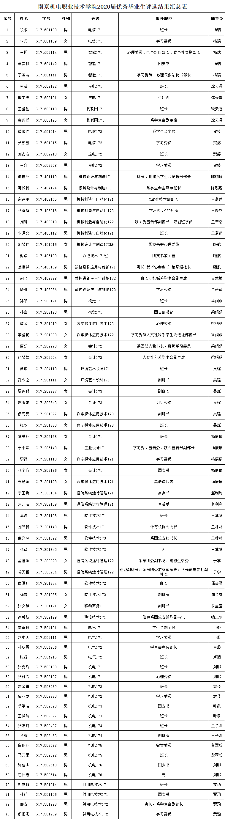 根据南机电院 学[2]号《关于评选2020届优秀毕业生的通知》,经班级评选,系部审核,学工处复核,决定拟推荐以下73名同学为2020届亚搏在线优秀毕业生。现予以公示,公示时间:2020年6月24日—2020年6月30日。联系人:宁燕,电话:025-84190262,18061230078。