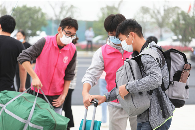 学校安排了数十辆校车分别赶赴南京南站、南京火车站、小红山长途汽车站接新生,各接站点滚动发车,高峰时刻随时增派车辆。每班次车辆都安排有老师带队迎接新生,并安排学生志愿者协助做好接站点的引导工作。
