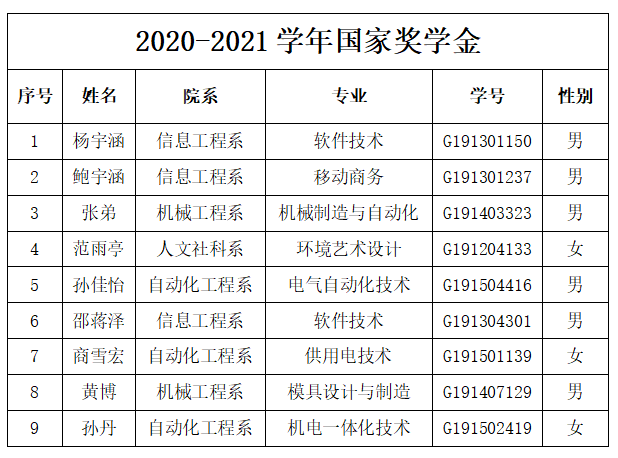根据《教育部财政部关于印发<本专科生国家奖学金评审办法>的通知》(教财函〔2019〕105号)以及《江苏省学生资助资金管理办法》《江苏省学生资助管理实施细则》《省教育厅关于做好2021年普通高校国家奖学金有关工作的通知》苏教助函〔2021〕12号文的相关精神。我院认真落实国家奖学金评审相关细则,各系部通过召开系部国家奖学金评审小组会议,认真贯彻落实国家奖学金评定要求,本着公开、公正、公平的原则,经学生个人申报,班级评议通过,上报系部评议小组,经系部评议审核通过,公示完毕。正式上报学院大学生资助管理中心,经学院大学生资助管理中心复审,召开学院2020-2021学年国家奖学金评审会,拟确定9位同学为亚搏在线2020-2021学年国家奖学金获得者。