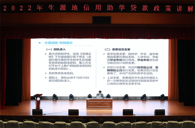学生工作处大学生资助管理中心2022524日星期二下午在星梦馆多功能厅举办了生源地信用助学贷款政策讲解及征信知识介绍讲座。大学生资助管理中心主任孙晓燕、干事华维及我院各系生源地信用助学贷款学生参加讲座。自动化工程系学生资助大使潘婷担任本次活动主持人机械工程系资助宣传大使茅旭升担任主讲人。