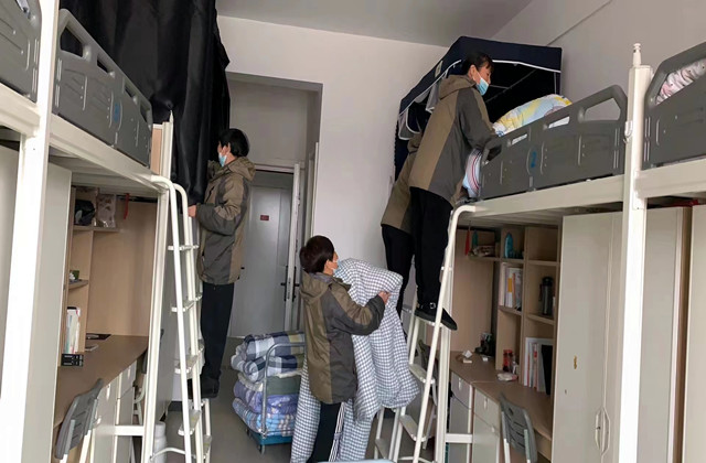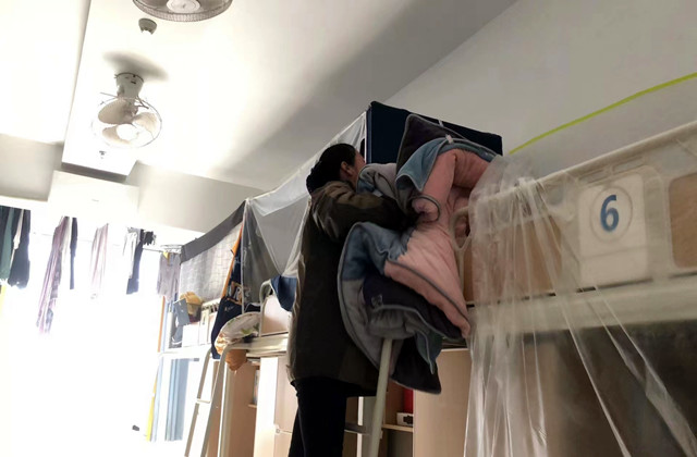 尽管前期准备很充分,实际过程中还是遇到了不少困难。负责润泽苑的丁秀花阿姨说:由于不少同学的床位安装了床帘,阿姨们需要用一只手掀起床帘,另一只手臂抱过被褥,在梯子上小心地保持平衡;搬运被褥的过程中,还需反复检查被褥上标签是否遗失,被褥、枕头是否蹭到了地。“尽管辛苦,能为孩子们做点事情,是最幸福的事情;想到孩子们能盖上阳光味儿的被子,我们都特别高兴!”丁阿姨开心地说道。