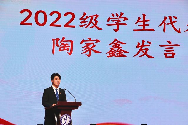 2022级学生代表人文社科系陶家鑫发言。他作为新时代的青年大学生、一名新的学生干部,勉励同学们要以榜样为镜,向先进看齐,要清晰地感知到自己身上所肩负的历史责任与时代使命。以新思想打造坚定信念,以新使命树立自身担当,以新目标锤炼自身能力。