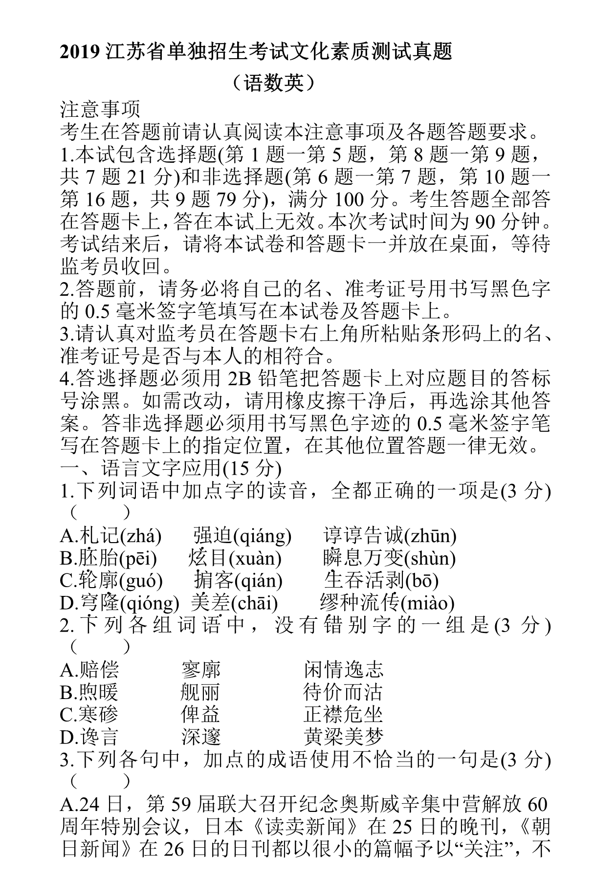 点击下载 2019年江苏省提前招生真题卷(语文)