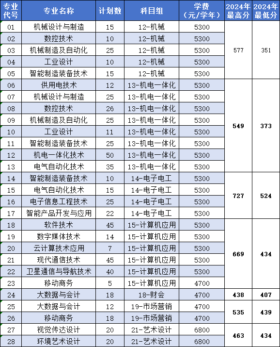 我校2025年职教高考专科第一批次拟投放招生计划600人,涉及机械、机电一体化、电子电工、计算机应用、财会、市场营销和艺术设计7个科目组19个专业,最终计划数以省考试院公布为准!