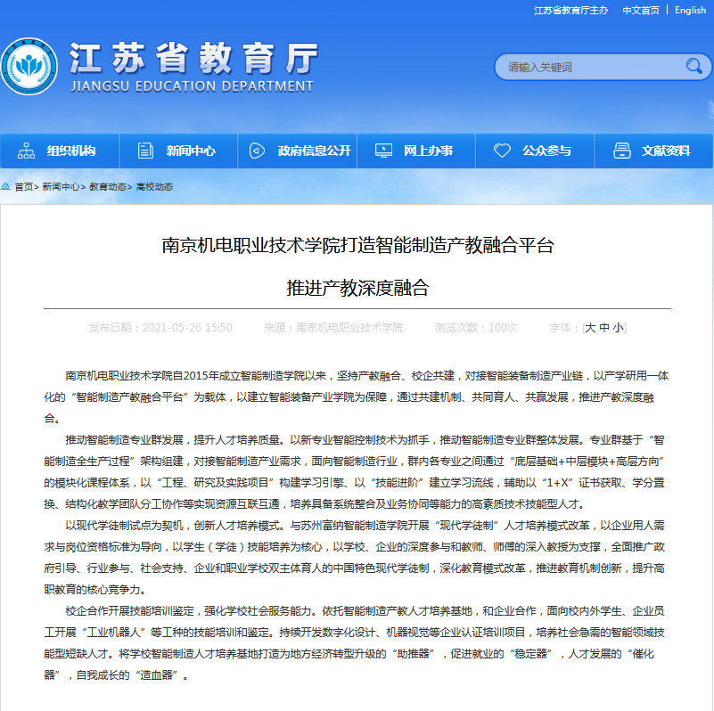 5月26日,江苏省教育厅官网“高校动态”栏目刊文:《亚搏在线打造智能制造产教融合平台,推进产教深度融合》,报道我校智能制造学院建设亮点。