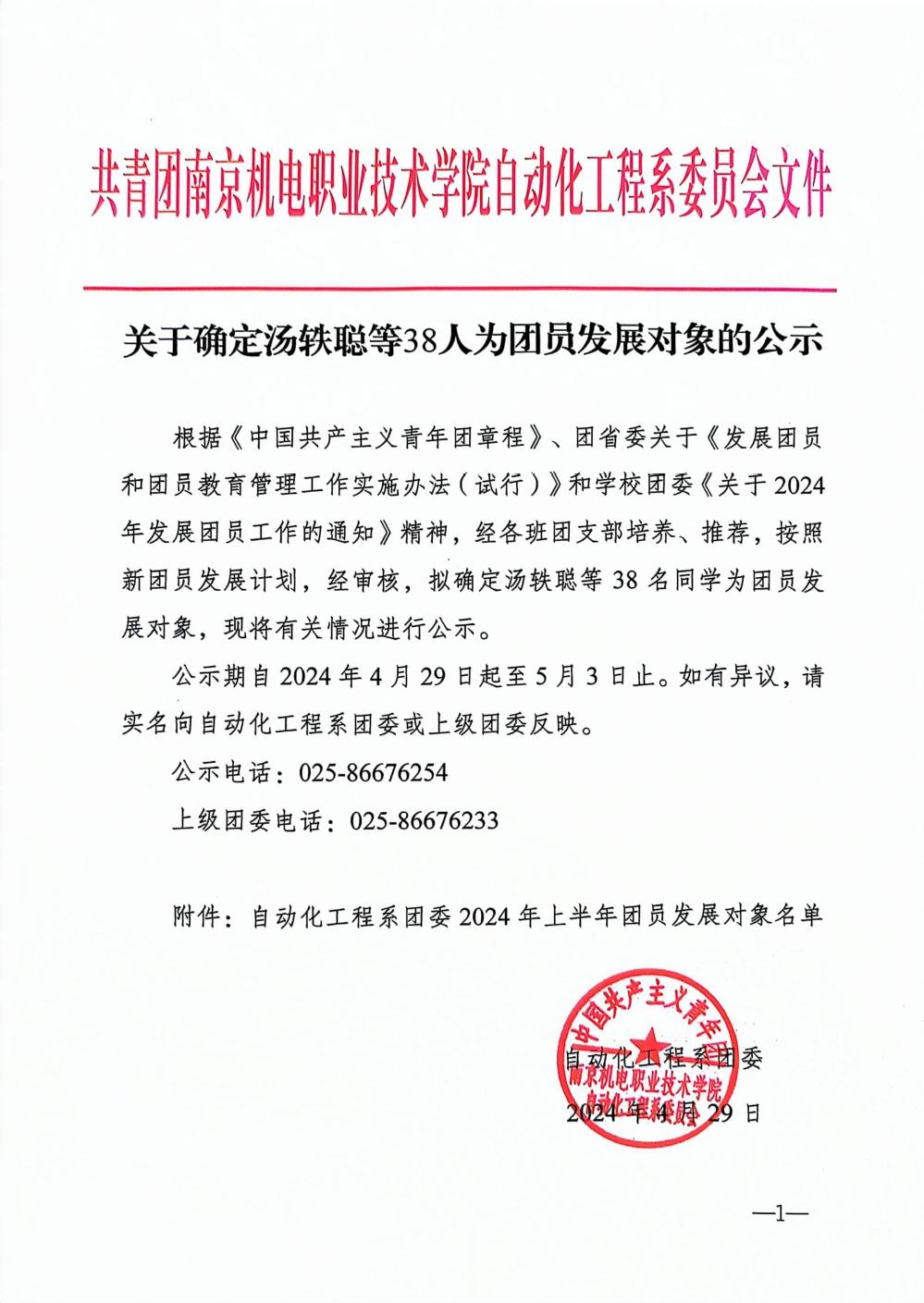 关于确定汤轶聪等38人为团员发展对象的公示