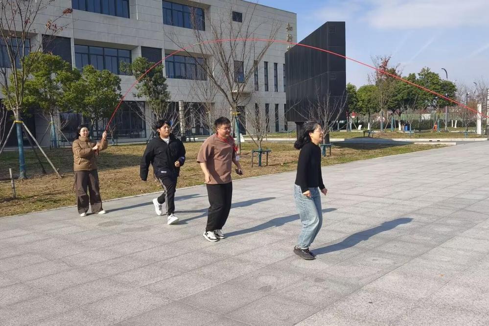 在长绳跳区域,则是团队协作的精彩呈现。摇绳的同学们双臂有力地挥动,长绳在空中划出一道道完美的弧线。参与其中的师生们鱼贯而入,在绳间灵活穿梭,跳跃自如。大家脸上洋溢着灿烂的笑容,展现出青春的朝气与活力。现场的加油声、欢笑声交织在一起,形成了一曲欢快的校园乐章。学生们不仅享受到了运动的乐趣,更在与老师的合作中,学会了如何更好地沟通协作,深刻体会到了团队合作的重要性。